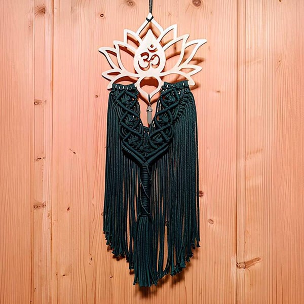 Jeder Wandbehang wird von mir auf Bestellung sorgfältig handgeknüpft. Im Mittelpunkt steht die filigrane Lotusblume aus feinem Holzlaserschnitt, wählbar in Yoga, Om oder leere Lotusblume. Ein dekorativer Anhänger aus Glas oder Stein ergänzt das Design ruhig und ausgewogen.