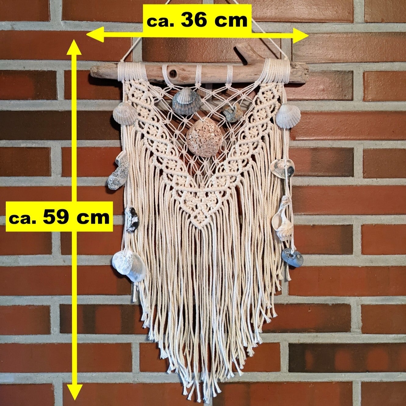 🌱 Materialien: 3 mm Baumwollgarn, naturbelassenes Treibholz, Muscheln, Hühnergötter