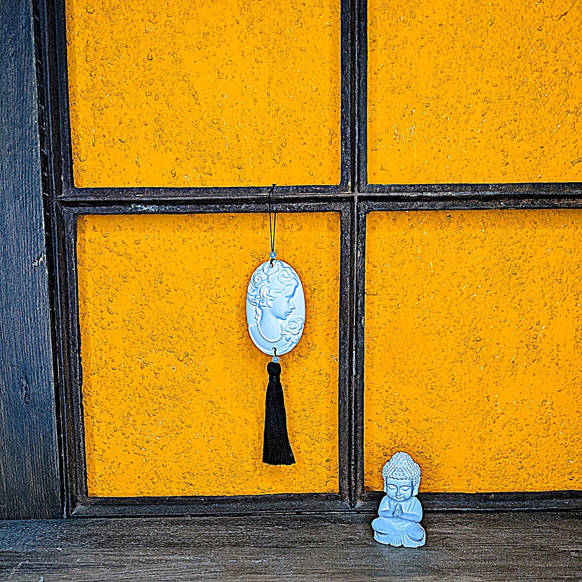 Der handgefertigte Aromastein „Indira“ aus hochwertiger Keramikgießmasse besticht durch seine Gestaltung in Form einer nostalgischen Jugendstil-Brosche mit Quaste. Jeder Duftstein ist ein Unikat und setzt als dekorativer Anhänger stilvolle Akzente in deinem Zuhause.