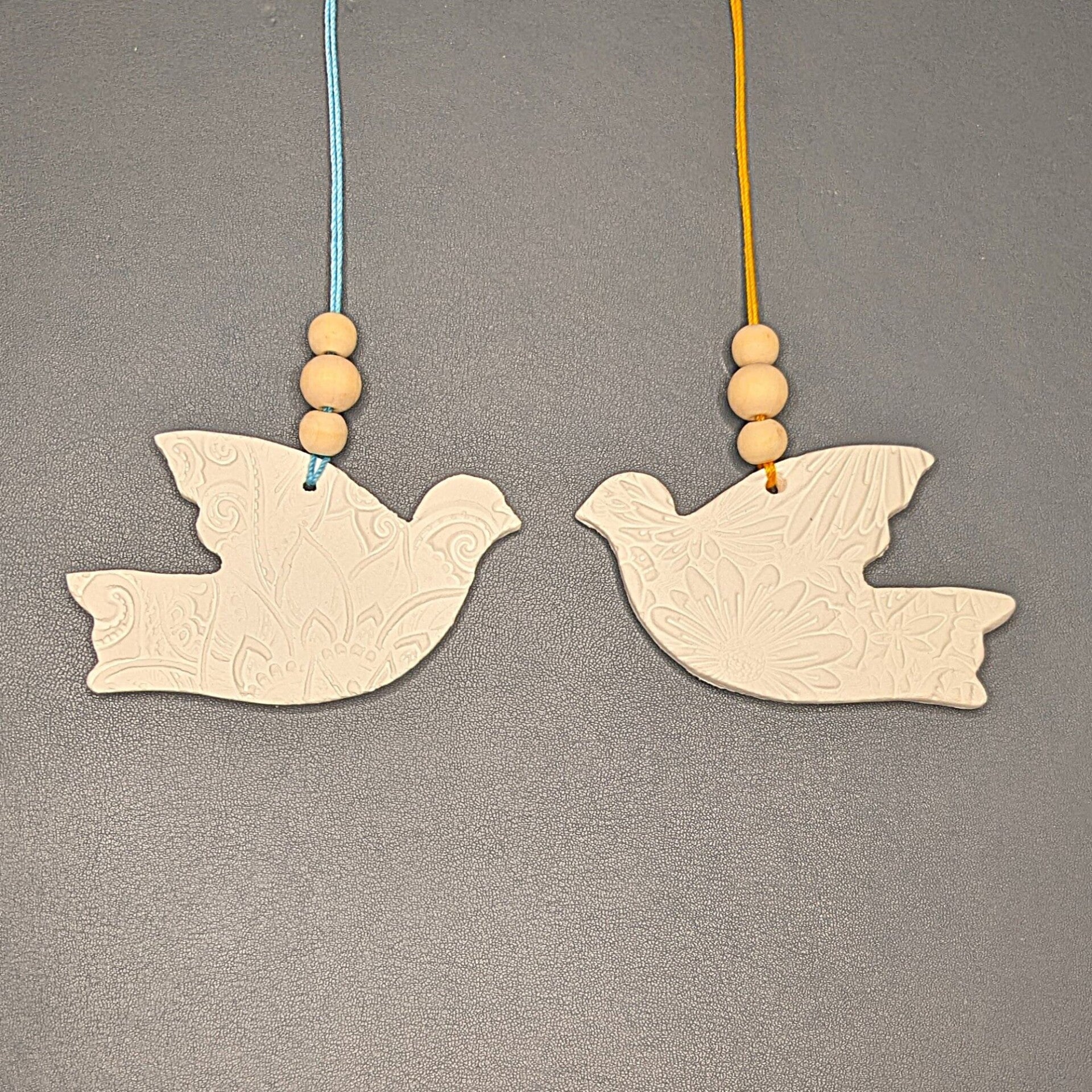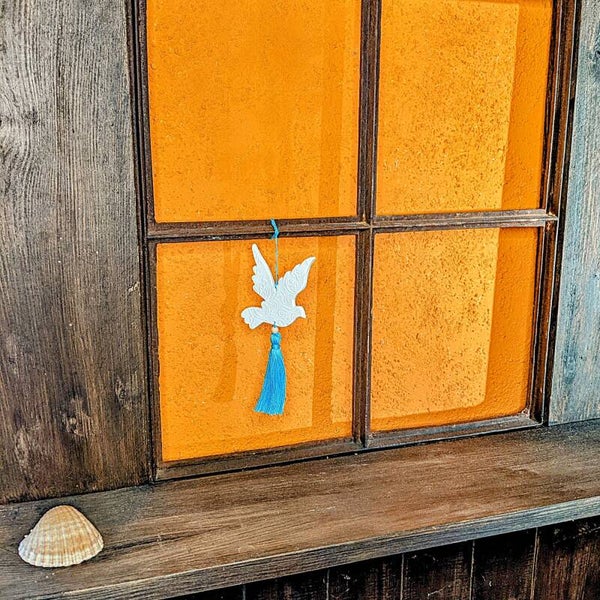 Der handgefertigte Tauben-Anhänger „Frida“ trägt eine feine Blumenprägung und strahlt Ruhe, Hoffnung und Sanftheit aus. Aus Modelliermasse gefertigt und beidseitig geprägt, ist er von allen Seiten gleich schön - ohne Vorder- oder Rückseite, ganz still und ausgewogen.
