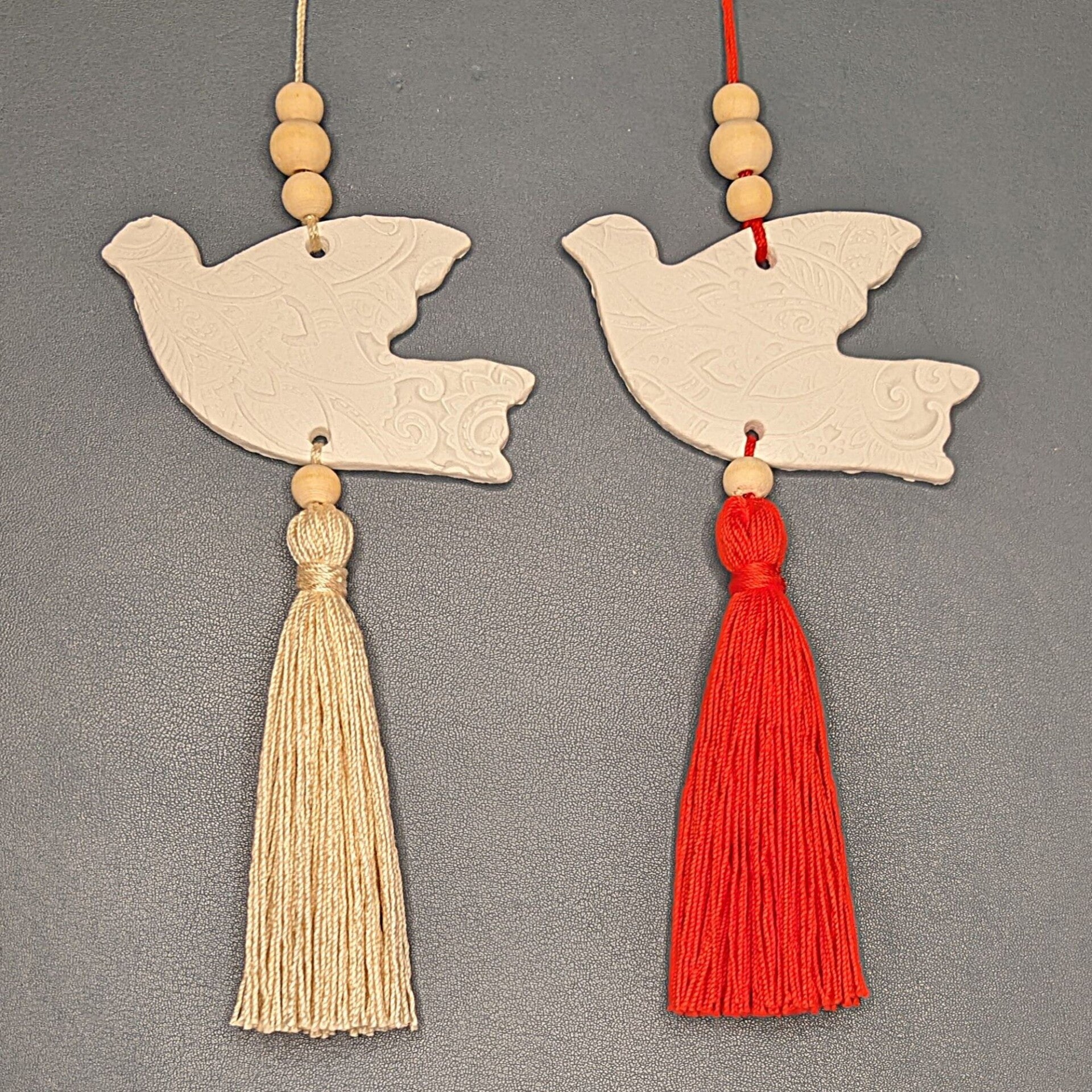 Wahlmöglichkeiten: Zur Auswahl stehen kleine bzw. große Tauben, die jeweils mit oder ohne Quaste bestellt werden können. Für die Bänder die zur Aufhängung angebracht werden und die Quasten, stehen zur folgende Optionen zur Auswahl: Natur, Sonnengelb, Rot und Hellblau. Die Anhänger können auf Wunsch mit einer Versiegelung („Tondicht“) versehen werden, die wasserabweisend ist und dem Anhänger einen leichten Glanz verleiht.