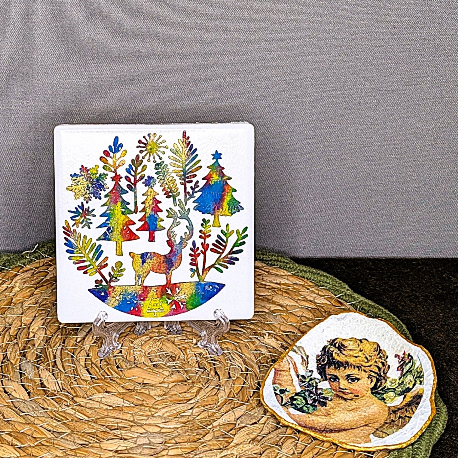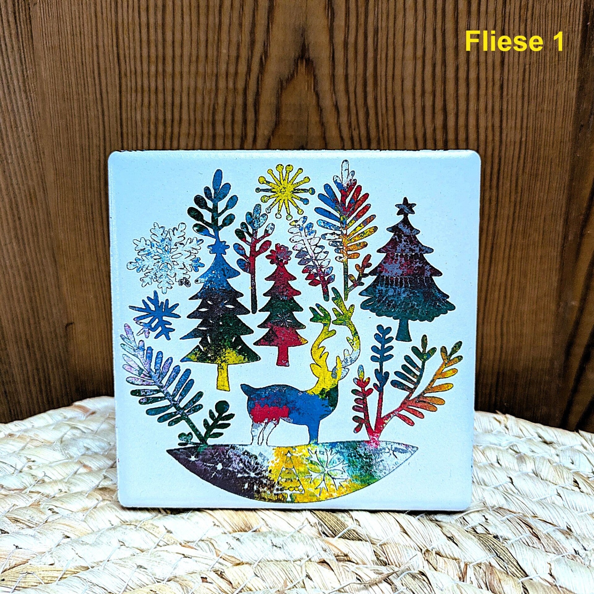 Kleine Schmuckfliese Rentier im Wald – handgefertigte Winterdeko „Seren“