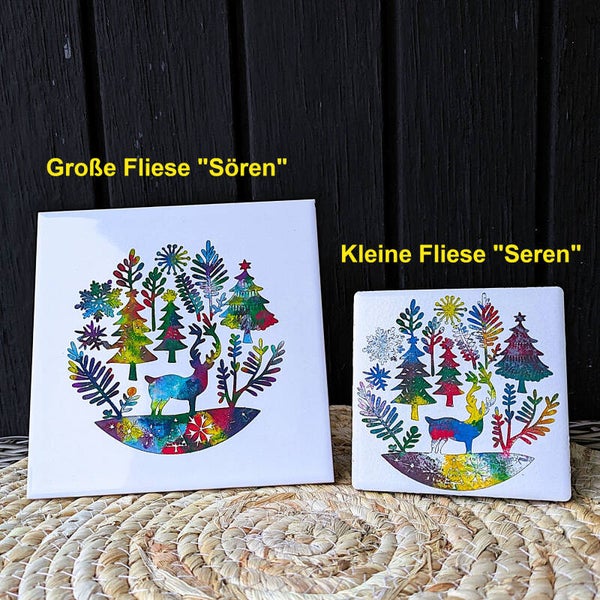 Die kleine Schmuckfliese „Seren“ zeigt ein Rentier im ruhigen Wald - sanft, klar und voller Leichtigkeit. Auf dem Regal, Schreibtisch oder an der Wand erinnert sie an entspannte Tage, frische Luft und die Schönheit der Natur.