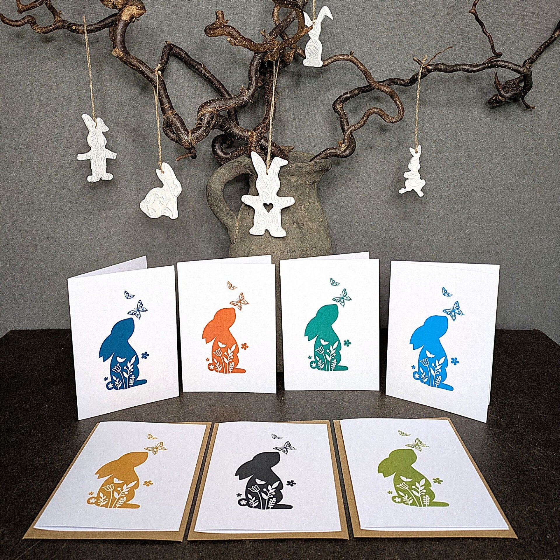• Set 3: Zwei Karten (Hasensilhouette mit floralen Details im Inneren) jeweils mit oder ohne Text