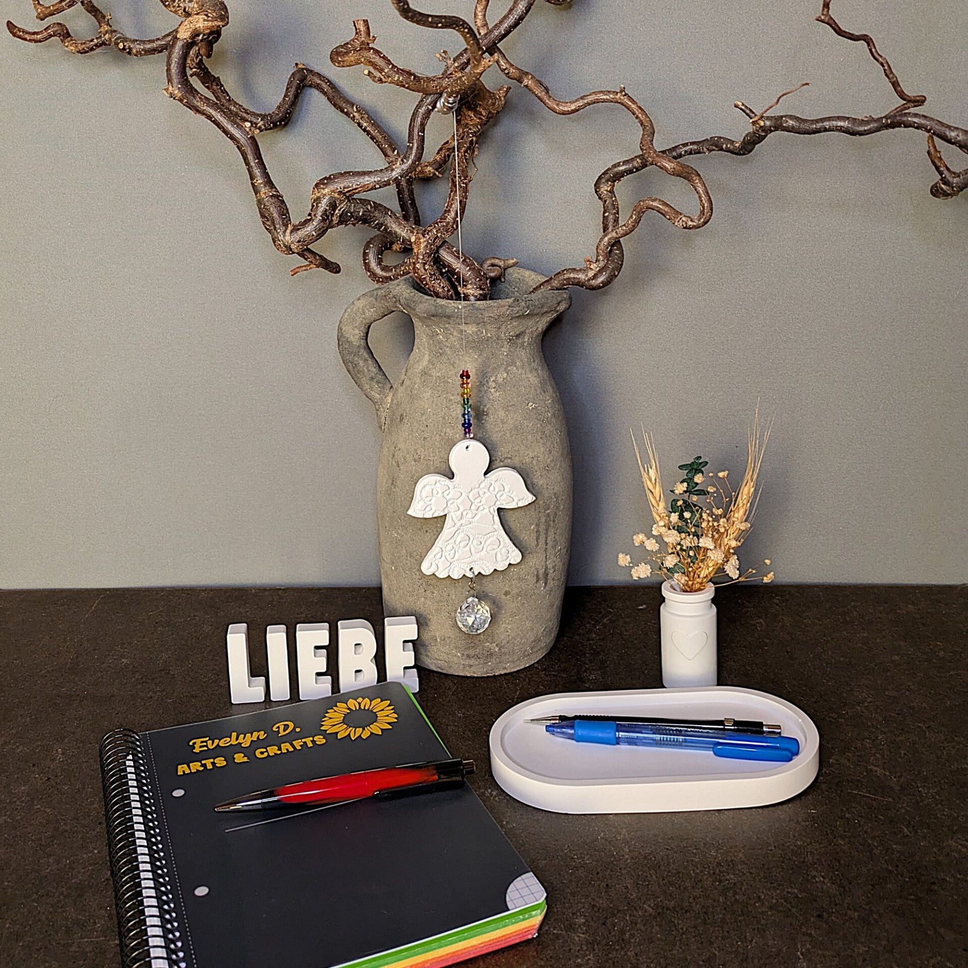 Set „Lieblingsplatz“ - Tablett · Wunschwort · Vase mit Trockenblumen · Herz